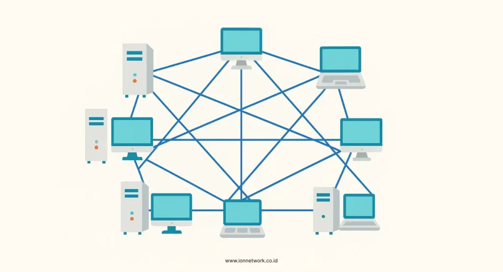 Kalau kamu mencari arsitektur jaringan yang tetap hidup meski satu dua jalur putus, topologi mesh jawabannya. Di sini, perangkat tidak hanya bergantung pada satu jalur. Mereka saling terhubung membentuk jejaring dengan banyak rute alternatif. Hasilnya: koneksi lebih tahan gangguan, lalu lintas bisa memutar mencari jalan terbaik, dan pemulihan terjadi otomatis.
